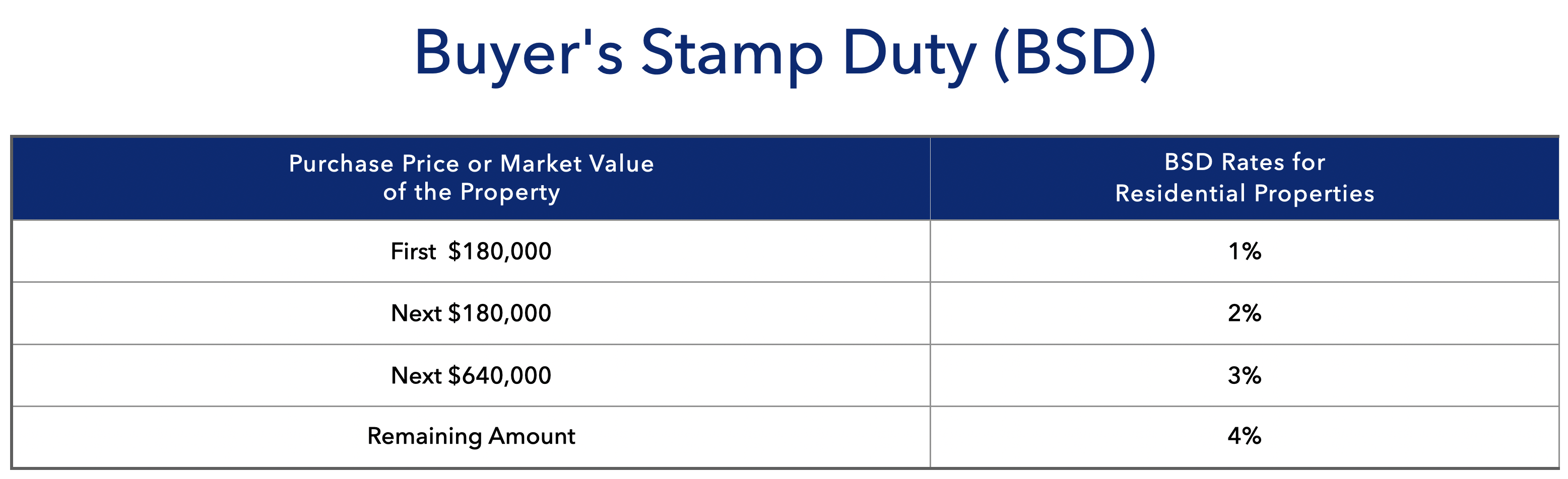 Buying and Selling Guide Loan to Value Buyer Stamp Duty (BSD) Additional Buyer Stamp Duty (ABSD) Seller Stamp Duty (SSD) Seller Stamp Duty Remission CPF Usage CPF Full and Basic Retirement Sum Property Cooling Measures Buyer Stamp Duty (BSD)